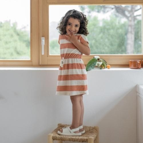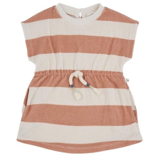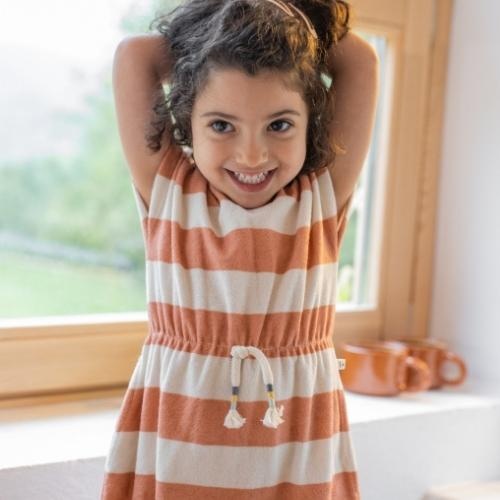 Shop de 1+ in the family ilaria dress coral jurk online bij Labels for Little Ones. Deze mooie jurk van badstof is uitgevoerd in een lichte kleur met all-over coral stripe, een horizontaal streepdessin in koraalroze kleur. Het zomerjurkje heeft een knoopj...
