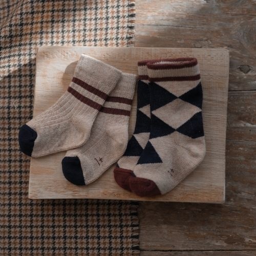Shop de 1+ in the family jeppe intarsia socks tortora sokken online bij Labels for Little Ones. Deze charmante sokken hebben een lichte beige basiskleur tortora en zijn voorzien van een stijlvol donkerblauw geruit dessin. De bordeauxrode randen aan de bovenkant geven een klassieke, warme uitstraling. De sokjes zijn gemaakt van zachte materialen en hebben een comfortabele, elastische fit die goed blijft zitten.