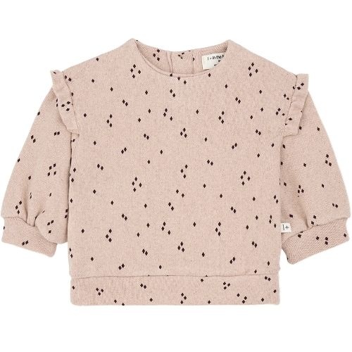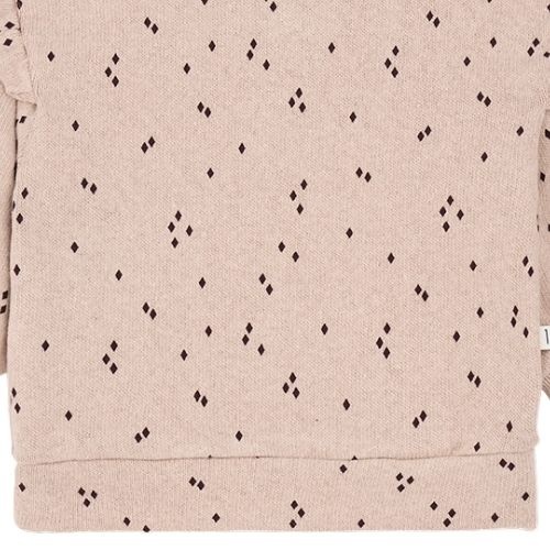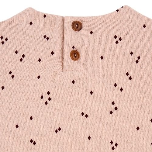 Deze zachte trui in lichtroze kleur nude is versierd met een subtiele ruitvormige print. De roezels op de schouders geven een speelse touch. Aan de onderzijde sluit de trui mooi aan dankzij de brede boord. Twee houten knoopjes aan de achterkant maken aan- en uittrekken eenvoudig.