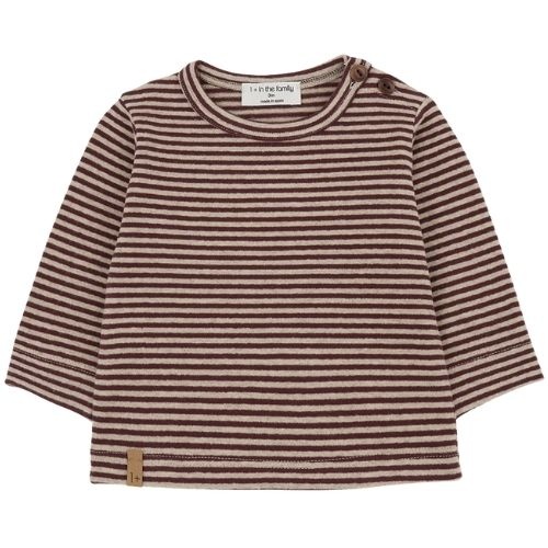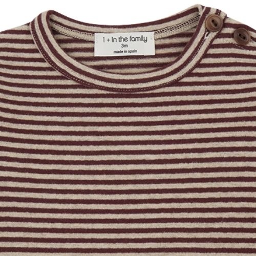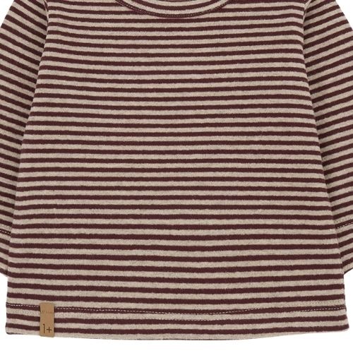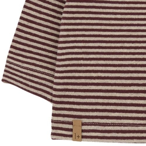 Shop de 1+ in the family olaf l.sleeve t-shirt melanzana tee online bij Labels for Little Ones. Deze fijne basic longsleeve is uitgevoerd in een gestreept design met beige en donkerrode kleur melanzana. Het smalle streeppatroon, de knoopjes op de schouder en de gestreepte boord maken het shirt helemaal af.