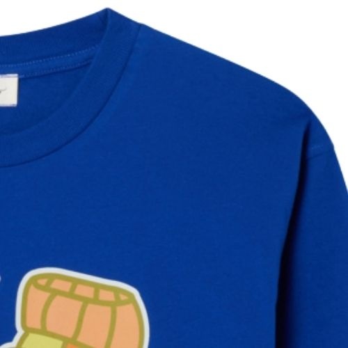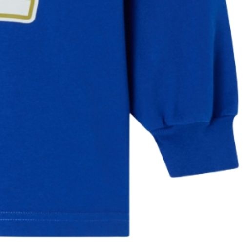* uitgevoerd in blauw met prints op voor- en achterkant