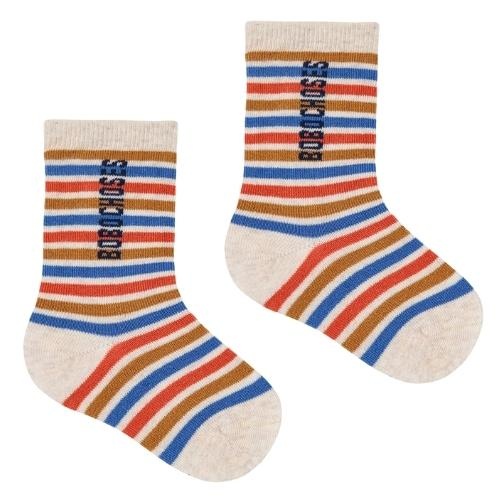 Shop de Bobo Choses baby farm long socks 2-pack multicolor sokken online bij Labels for Little Ones. Deze vrolijke sokken zijn uitgevoerd in een lichte basiskleur met all-over multicolor stripe van blauwe, bruine en rode strepen op de hals. De Bobo sokken...