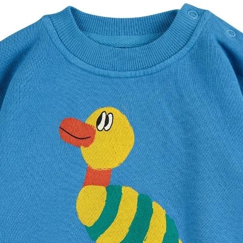Shop de Bobo Choses baby striped duck sweatshirt blue trui online bij Labels for Little Ones. Deze sweater is uitgevoerd in een frisse blauwe kleur met op de voorkant een grote print striped duck van een gele eend met groene strepen. Op de schouder zitten...