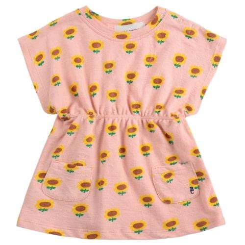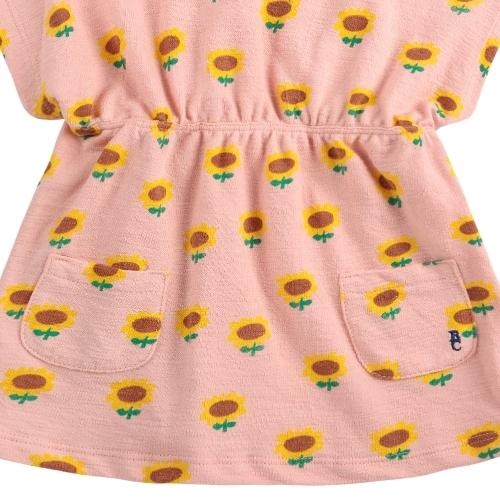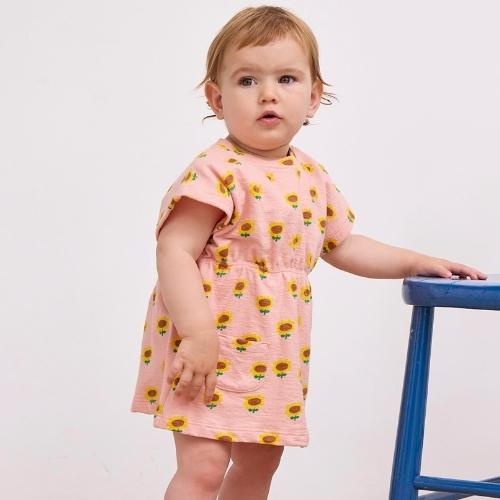 Shop de Bobo Choses baby sunflower all over dress light pink jurk online bij Labels for Little Ones. Deze leuke jurk met korte mouwen is uitgevoerd in een lichtroze kleur met een vrolijke all-over sunflower print van kleine zonnebloemen. Het baby jurkje is getailleerd, heeft op de voorkant twee opgestikte zakjes en drukknoopjes op de schouder voor extra gemak bij aan- en uitkleden. Een comfortabel zomerjurkje door de fijne pasvorm en zachte, soepele katoenen stof.