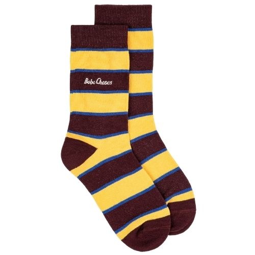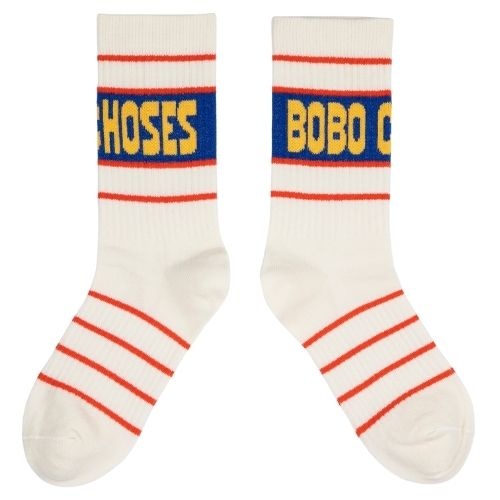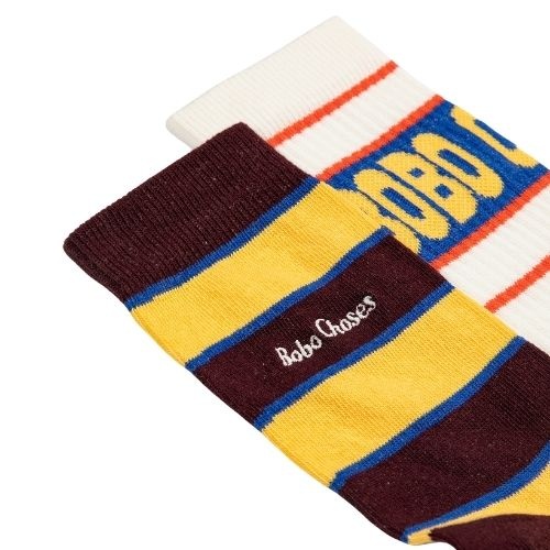 Shop de Bobo Choses BC long socks 2-pack - sokken online bij Labels for Little Ones. Twee paar vrolijke sokken uitgevoerd met een verschillend design. Een paar sokken in het bruin geel gestreept en de ander in witte kleur met rode en blauwe details en op