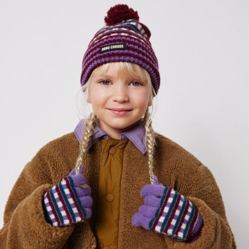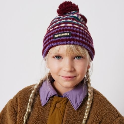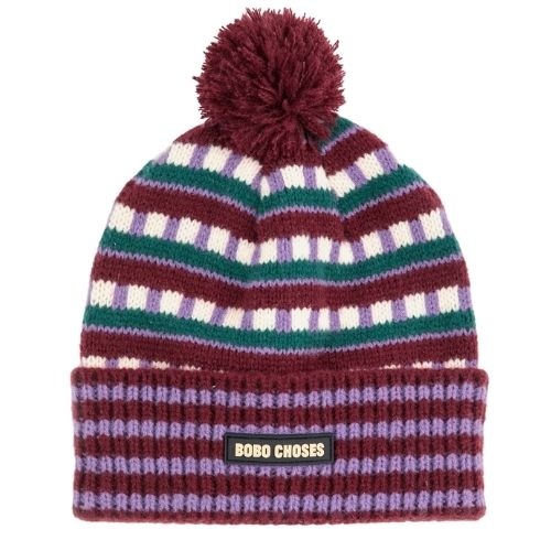 Shop de Bobo Choses bobo choses jacquard beanie purple muts online bij Labels for Little Ones. Deze vrolijke muts is uitgevoerd in een multicolor dessin met een jacquard print en een pompon bovenop. De muts heeft een omgeslagen boord met een gestreepte pr...