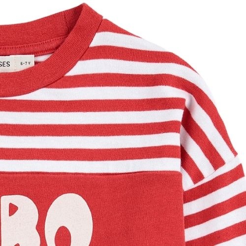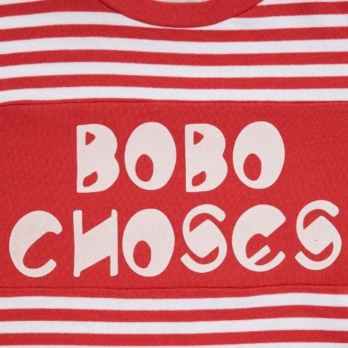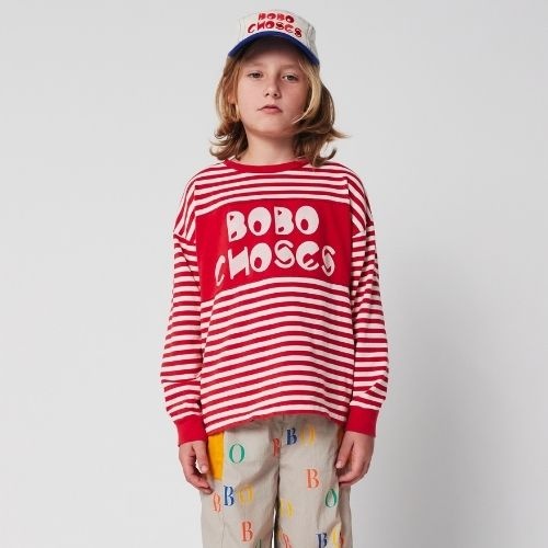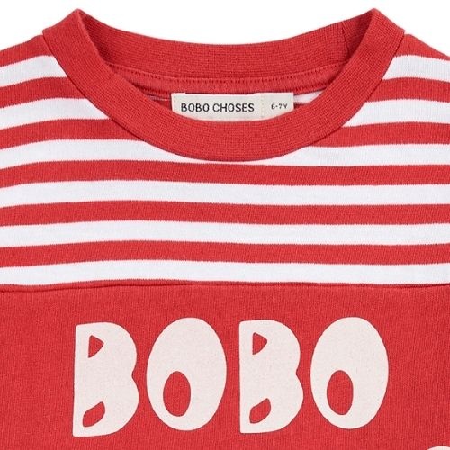 Shop de Bobo Choses bobo choses stripes t-shirt red tee online bij Labels for Little Ones. Dit shirt met lange mouwen is uitgevoerd in een gestreept dessin van horizontale rode en witte strepen met op de voorkant een rood vlak met witte tekstprint ‘bobo choses’. De Bobo longsleeve heeft een comfortabele fit door de fijne pasvorm en zachte katoenen stof.