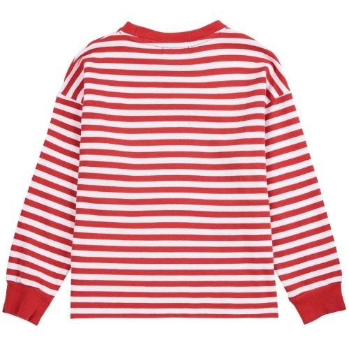 Shop de Bobo Choses bobo choses stripes t-shirt red tee online bij Labels for Little Ones. Dit shirt met lange mouwen is uitgevoerd in een gestreept dessin van horizontale rode en witte strepen met op de voorkant een rood vlak met witte tekstprint ‘bobo c...