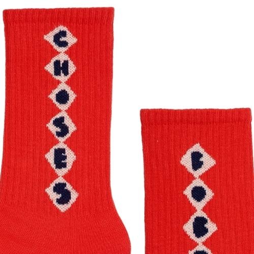 Shop de Bobo Choses bobo diamonds long socks red sokken online bij Labels for Little Ones. Deze leuke sokken zijn uitgevoerd in een rode kleur red met een tekstprint aan de zijkant van de sok met bobo en choses. De sokken hebben een comfortabele fit door