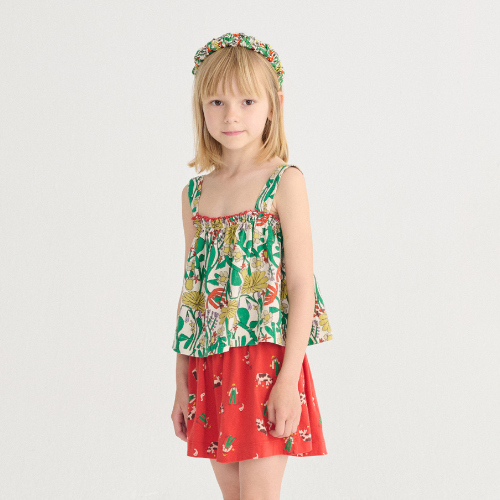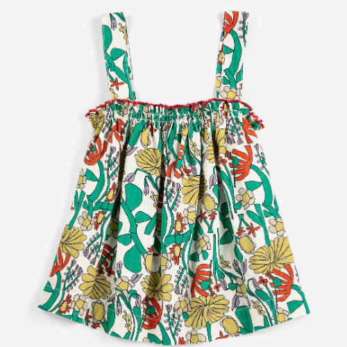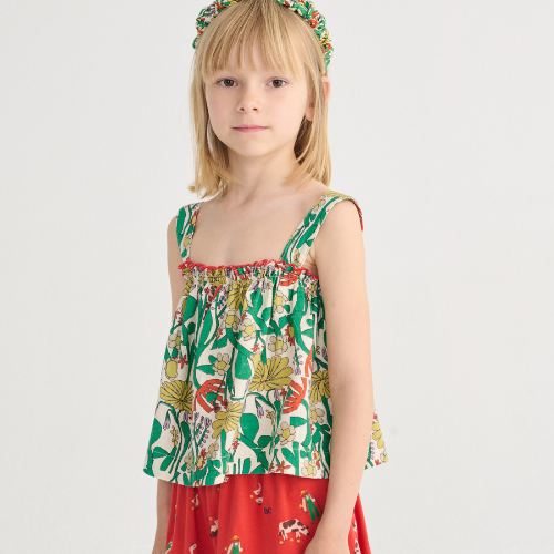 Shop de Bobo Choses Color Herbalist all over woven top online bij Labels for Little Ones. Deze leuke mouwloze zomertop is uitgevoerd in een witte basis kleur met een vrolijke all-over gekleurde bloemen print. Het topje heeft mooie schouderbandjes bij de schouders en de randjes van het bovenlijfje zijn versierd met een rood randje. Een comfortabel kledingstuk door de fijne pasvorm en zachte, soepele katoenen stof.