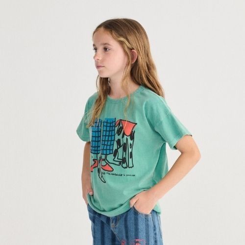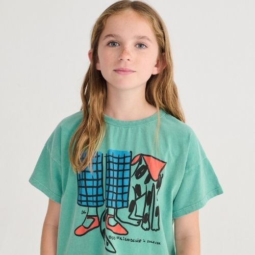 Shop de Bobo Choses Dog Friendship tshirt online bij Labels for Little Ones. Dit leuke shirt met korte mouwen is uitgevoerd in een groene kleur en heeft een vrolijke hondenprint met tekstprint ‘Dog friendship is forever’op de voorkant. Een comfortabele sh...