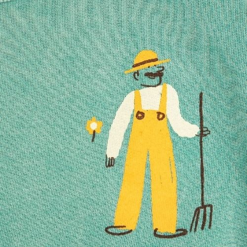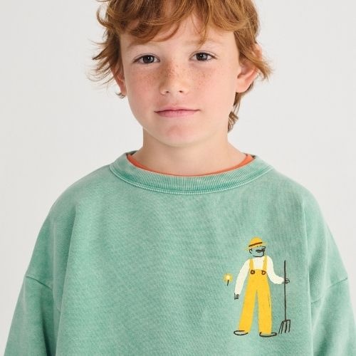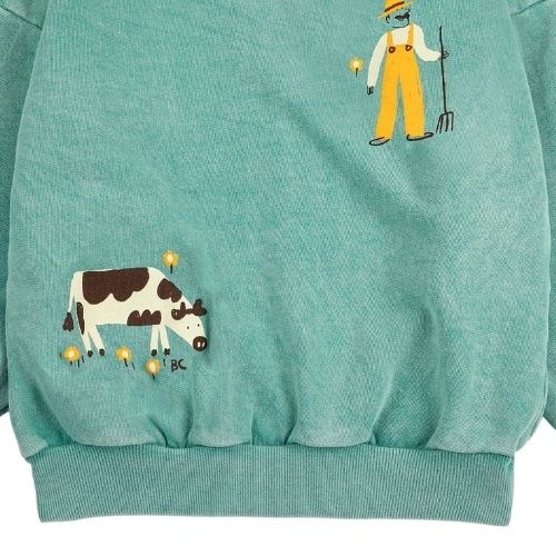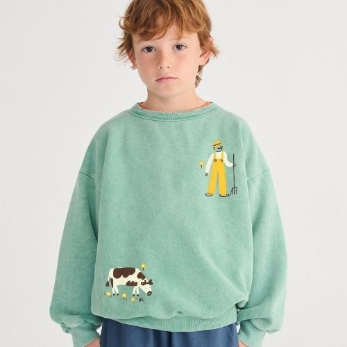 Shop de Bobo Choses Farm Adventure sweatshirt online bij Labels for Little Ones. Deze vrolijke sweater is uitgevoerd in een groene kleur met op de voorkant een vrolijke print van een boer en een koe. Een comfortabele trui door de fijne pasvorm en zachte biologische katoenen stof.