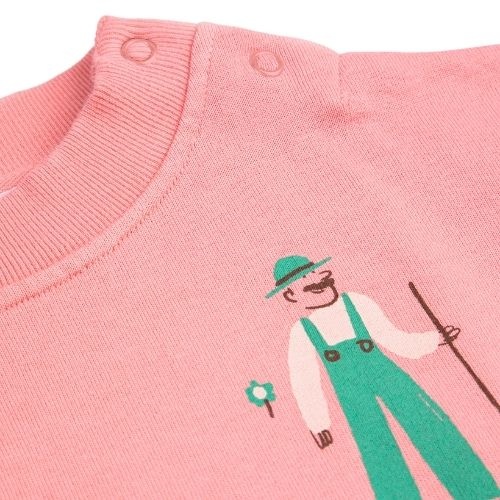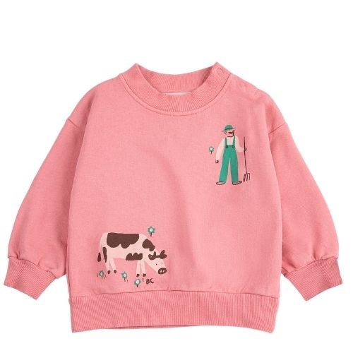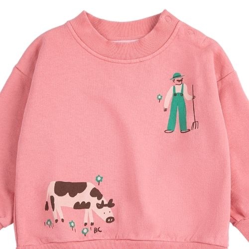 Shop de Bobo Choses Farm Adventure sweatshirt online bij Labels for Little Ones. Deze vrolijke sweater is uitgevoerd in een roze kleur met op de voorkant een vrolijke print van een boer en een koe. De baby sweater heeft drukknoopjes op de schouder voor extra gemak bij het aan- en uitkleden. Een comfortabele trui door de fijne pasvorm en zachte biologische katoenen stof.