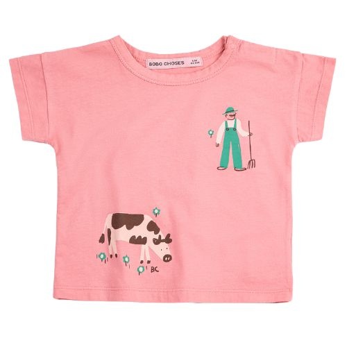 Shop de Bobo Choses Farm Adventure tshirt online bij Labels for Little Ones. Dit leuke shirt met korte mouwen is uitgevoerd in een roze kleur met een grappige print op de voorkant van een koe en een boer en heeft een wat korter model. Een comfortabele shortsleeve door de fijne pasvorm en zachte biologische katoenen stof.
