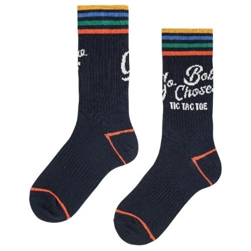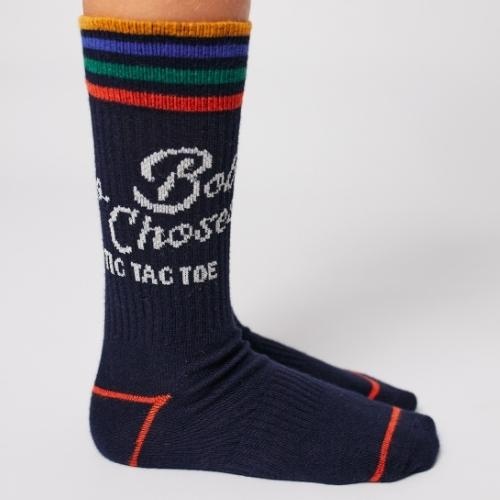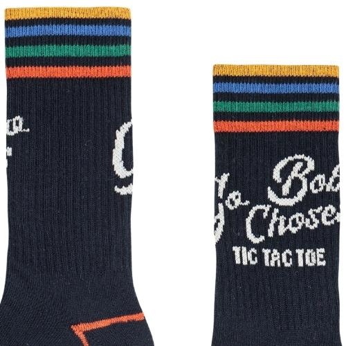 Shop de Bobo Choses go bobo short socks khaki sokken online bij Labels for Little Ones. Deze leuke sokken zijn uitgevoerd in een donkerblauwe kleur met op de hals een witte print en de tekstprint ‘go bobo choses tic tac toe’. Bij de tenen en bij de hak rood oranje gestreepte details. De Bobo sokken hebben een comfortabele fit door de fijne pasvorm en zachte stofsamenstelling met biologisch katoen.