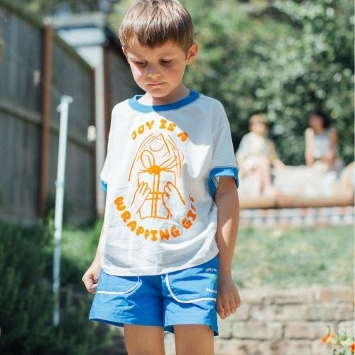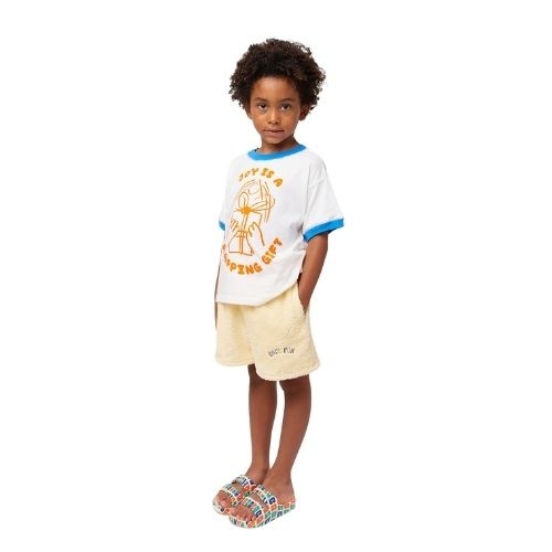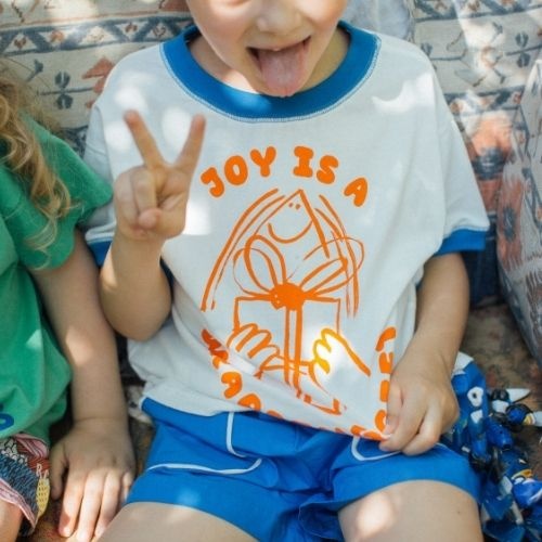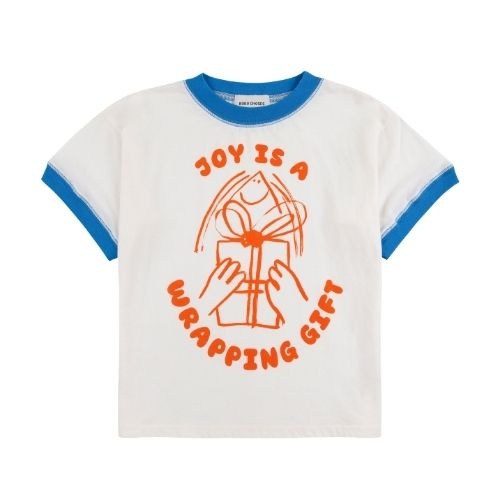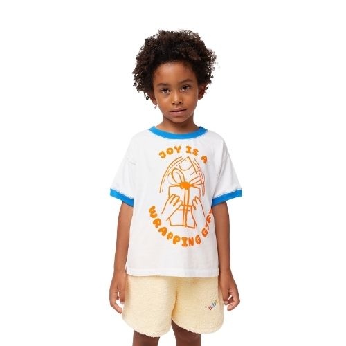 Shop de Bobo Choses joy is a wrapping gift tee t-shirt online bij Labels for Little Ones. Dit toffe shirt met korte mouwen is uitgevoerd in een witte kleur met op de voorkant een grote oranje tekst met print en heeft lichtblauwe boorden bij de halslijn en mouwuiteinden. Een comfortabele shortsleeve door de fijne pasvorm en zachte biologische katoenen stof.