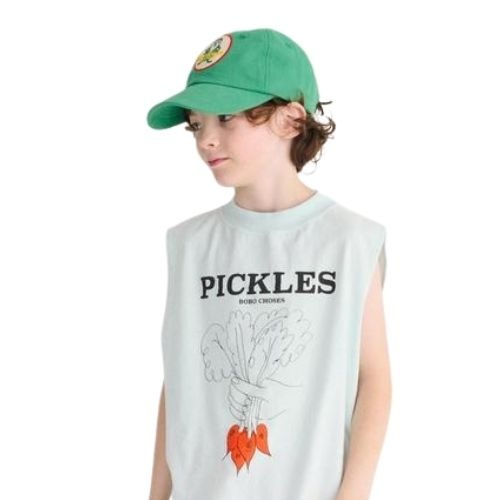 Shop de Bobo Choses Mr Pickles Patch cap online bij Labels for Little Ones. Deze toffe pet is uitgevoerd in een frisse groene kleur en heeft op de voorkant een vrolijke patch met merknaam.