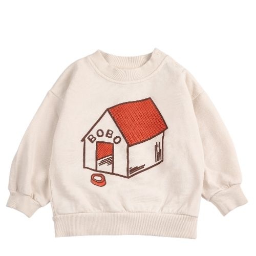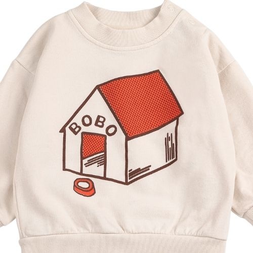 Shop de Bobo Choses Pickles is at Home sweatshirt online bij Labels for Little Ones. Deze vrolijke sweater is uitgevoerd in een witte kleur met op de voorkant een grote grappige print van een hondenhok en tekstprint ‘Bobo’. De baby sweater heeft drukknoop...