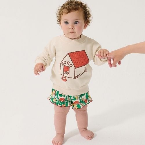 Shop de Bobo Choses Pickles is at Home sweatshirt online bij Labels for Little Ones. Deze vrolijke sweater is uitgevoerd in een witte kleur met op de voorkant een grote grappige print van een hondenhok en tekstprint ‘Bobo’. De baby sweater heeft drukknoopjes op de schouder voor extra gemak bij het aan- en uitkleden. Een comfortabele trui door de fijne pasvorm en zachte biologische katoenen stof.