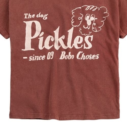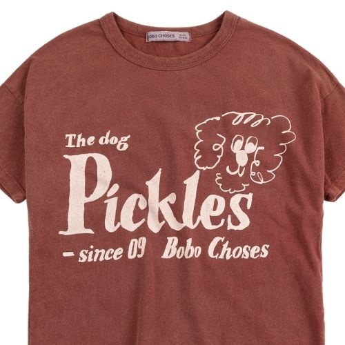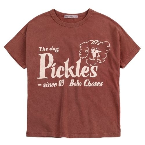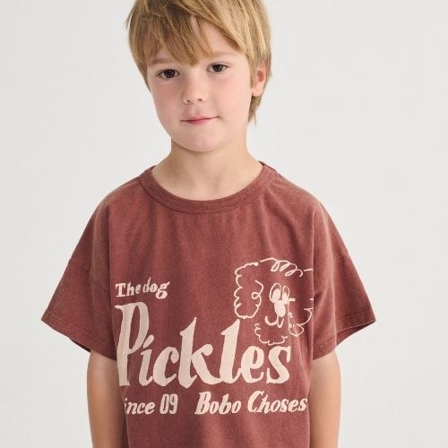 Shop de Bobo Choses Pickles The Dog tshirt online bij Labels for Little Ones. Dit leuke shirt met korte mouwen is uitgevoerd in een bruine kleur met een witte tekstprint met een klein hondje op de voorkant. Een comfortabele shortsleeve door de fijne pasvorm en zachte biologische katoenen stof.
