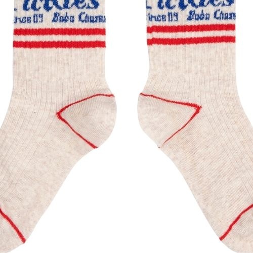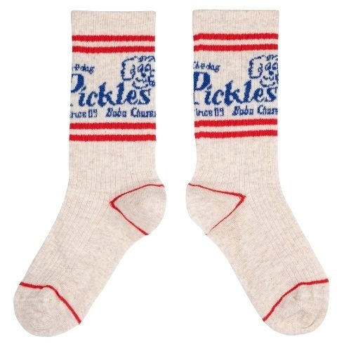 Shop de Bobo Choses Pickles The Dog long socks online bij Labels for Little Ones. Een vrolijk paar sokken uitgevoerd in een witte kleur met op de hals van de sok een print met een hondje en merktekst in het blauw. De sokken hebben een comfortabele fit door de fijne pasvorm en zachte stof samenstelling met biologisch katoen.