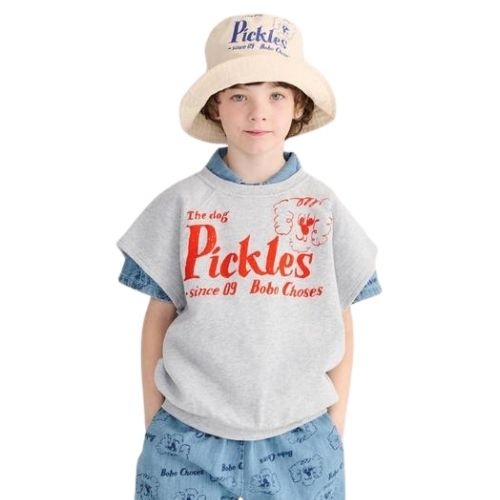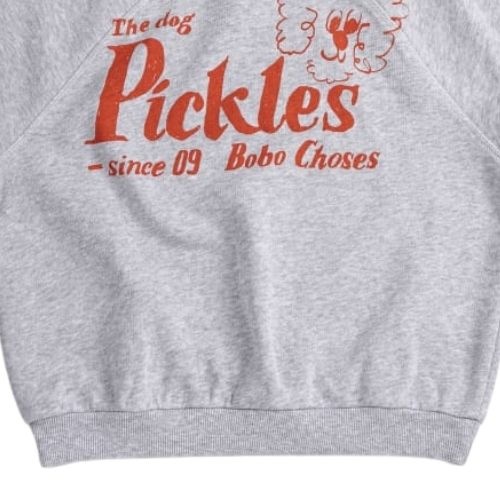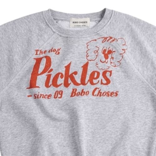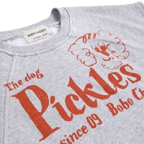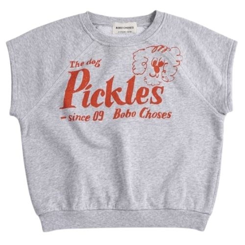 Shop de Bobo Choses Pickles The Dog sleeveless sweatshirt online bij Labels for Little Ones. Deze vrolijke sweater is uitgevoerd in een lichtgrijze kleur met op de voorkant een print met ‘Pickles The Dog’ en merknaam. Een comfortabele trui door de fijne pasvorm en zachte biologische katoenen stof.