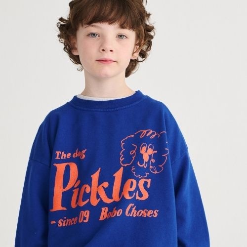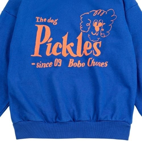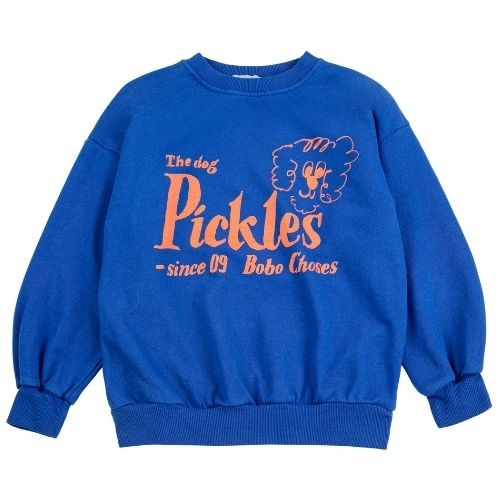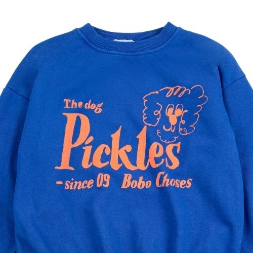 Shop de Bobo Choses Pickles The Dog sweatshirt online bij Labels for Little Ones. Deze vrolijke sweater is uitgevoerd in een blauwe kleur met op de voorkant een grote tekstprint ‘Pickles The Dog’ ,merknaam en een hondje. Een comfortabele trui door de fijne pasvorm en zachte biologische katoenen stof.