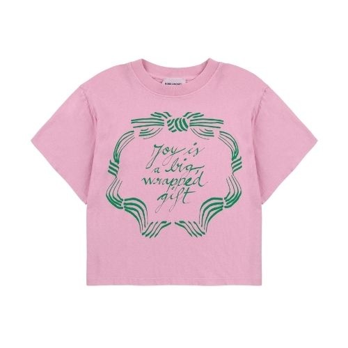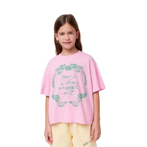 Shop de Bobo Choses ribbon gift tee t-shirt online bij Labels for Little Ones. Dit toffe shirt met korte mouwen is uitgevoerd in een roze kleur met op de voorkant een grote groene tekst print. Een comfortabele shortsleeve door de fijne pasvorm en zachte biologische katoenen stof.