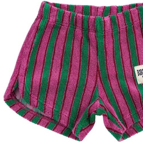 Shop de Bobo Choses striped terry cloth shorts - korte broek online bij Labels for Little Ones. Deze leuke korte broek is uitgevoerd in zachte badstof met vrolijke strepen en heeft een witte patch met merkdetail op de broekspijp. Een comfortabele short door de fijne pasvorm en zachte biologische katoenen stof.