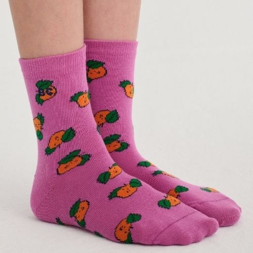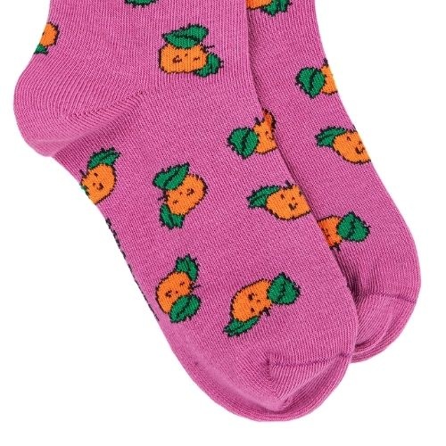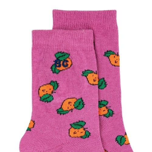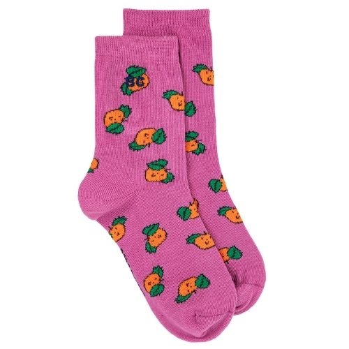 Shop de Bobo Choses tangerine all over short socks - sokken online bij Labels for Little Ones. Een vrolijk paar sokken uitgevoerd in een paarse kleur met een all-over tangerine fruit print van mandarijnen en op de hals van de sok een geborduurde ‘bc’. De