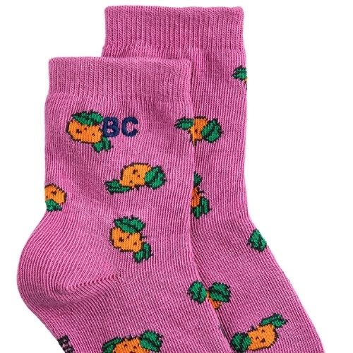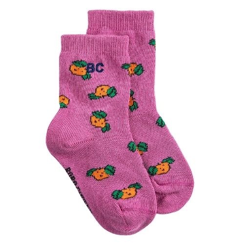 Shop de Bobo Choses tangerine all over short socks sokken online bij Labels for Little Ones. Een vrolijk paar sokken uitgevoerd in een paarse kleur met een all-over tangerine fruit print van mandarijnen en op de hals van de sok een geborduurde ‘bc’. De so...