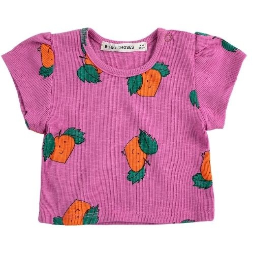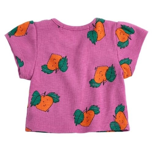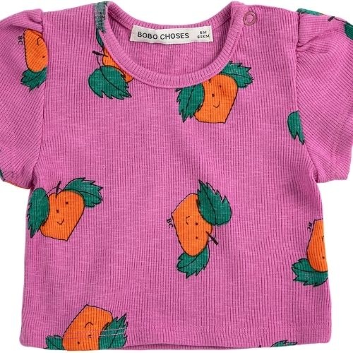 Shop de Bobo Choses tangerine all over t-shirt online bij Labels for Little Ones. Dit leuke shirt met korte mouwen is uitgevoerd in een paarse kleur met een vrolijke Tangerine all-over print met een gezichtje. De baby tee heeft drukknoopjes op de schouder...