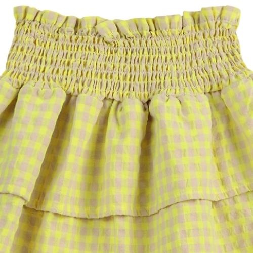 Shop de Bobo Choses vichy ruffle skirt multicolor rok online bij Labels for Little Ones. Deze leuke rok is uitgevoerd met een all-over vichy print van neon gele en beige vierkantjes. Aan de onderkant zit een rode kleine geborduurde tekstprint ‘bobo choses...