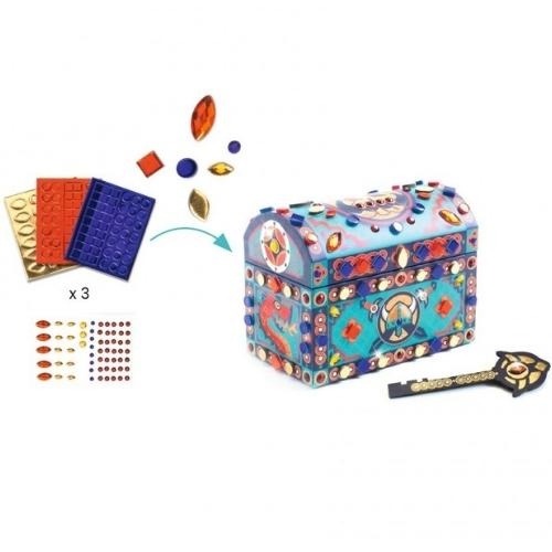 * inhoud: 1 kistje van stevig karton, 1 nep bodem, 1 sleutel, 3 vellen zelfklevende metallic mozaïeken, 1 vel edelsteenstickers, 1 gedetailleerde gebruiksaanwijzing.