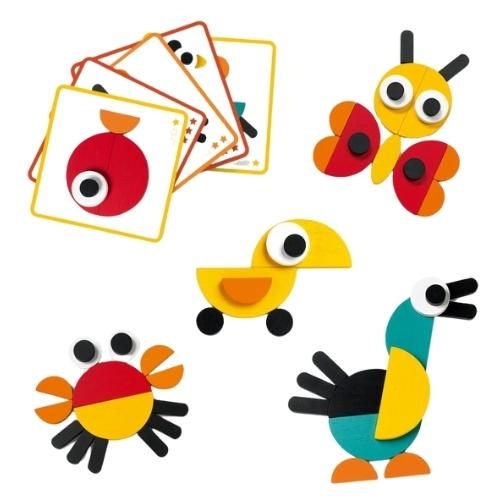 Het Djeco ze geanimo blocks spelletje bestel je online bij Labels for Little Ones. Leg de 29 gekleurde houten vormen naar eigen inzicht en fantasie neer of gebruik de voorbeeldkaarten om figuren na te maken, zoals een vogel, rups, uil en vissen. Je kindje leert zo spelenderwijs geometrische vormen kennen.