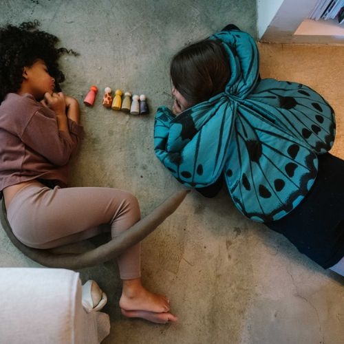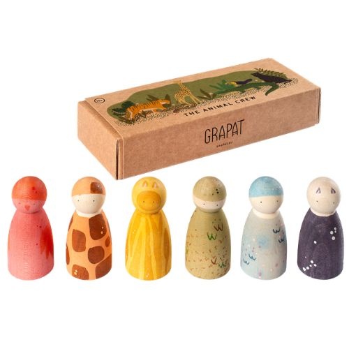 Geef een creatieve draai aan de bekende Nins® met deze Animal Crew! Deze set van zes houten speelfiguren, verkleed als dieren, is het perfecte voorbeeld van open-ended play. Deze zes houten dierenvriendjes dagen kinderen uit om zelf verhalen te verzinnen. Van rollenspellen tot het bouwen van een compleet bos (een 'small world') in de woonkamer: alles mag!