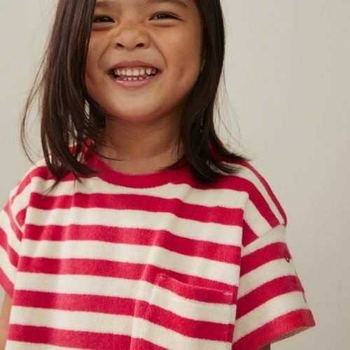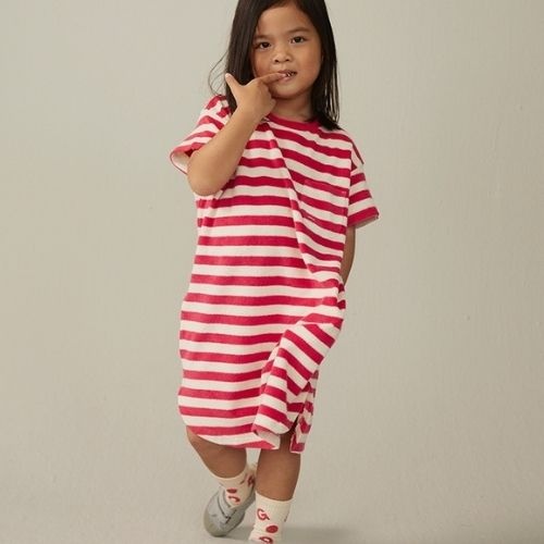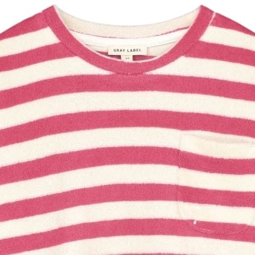 Shop de Gray Label pop terry oversized tee dress cherry cream jurk online bij Labels for Little Ones. Deze toffe jurk met korte mouwen van badstof is uitgevoerd in een gestreept dessin van gebroken witte en felroze strepen. De t-shirt jurk heeft een oversized fit, een ronde afwerking aan de onderkant met splitjes aan de zijkant, een borstzakje en twee steekzakken. Door de zachte biologische katoen en fijne pasvorm heeft deze jurk een comfortabele fit.