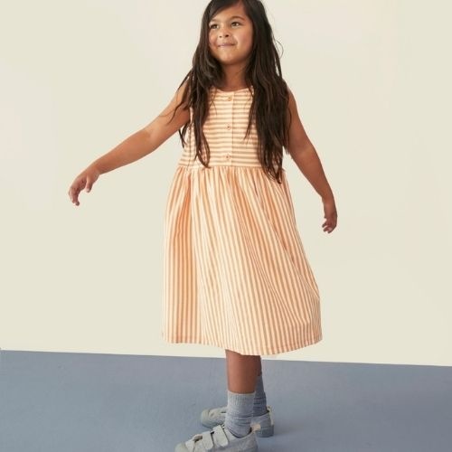 Shop de Gray Label sleeveless dress gots melon - cream jurk online bij Labels for Little Ones. Deze toffe jurk met mouwloos moder is uitgevoerd in een gestreept dessin van gebroken witte en oranje strepen. Het jurkje heeft een oversized fit en knoopjes op het bovenlijfje.. Door de zachte biologische katoen en fijne pasvorm heeft deze jurk een comfortabele fit.