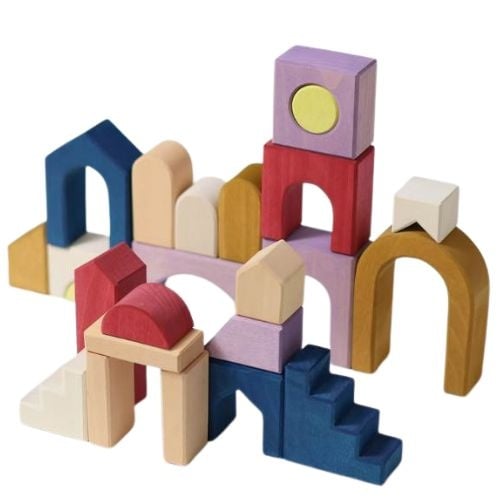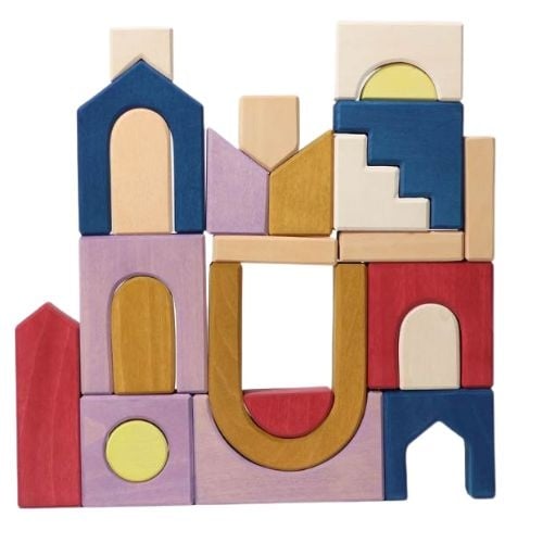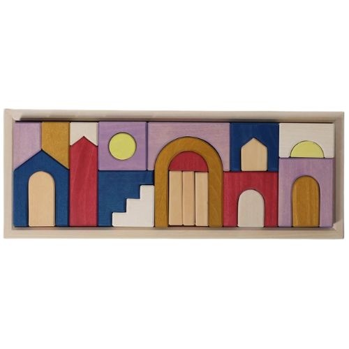 De Grimm's blokkenset panorama bestel je online bij Labels for Little Ones. Een prachtige, uitgebreide houten blokkenset, bestaande uit 24 diverse bouwstenen en een houten frame in nieuwe kleurstelling van Grimm's. Kinderen verkennen de functionaliteit en veelzijdigheid van deze vormen en kunnen er mooie bouwwerken mee creëren, zoals huizen, bruggen of zelfs een complete stad en patronen mee leggen.