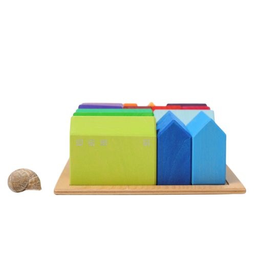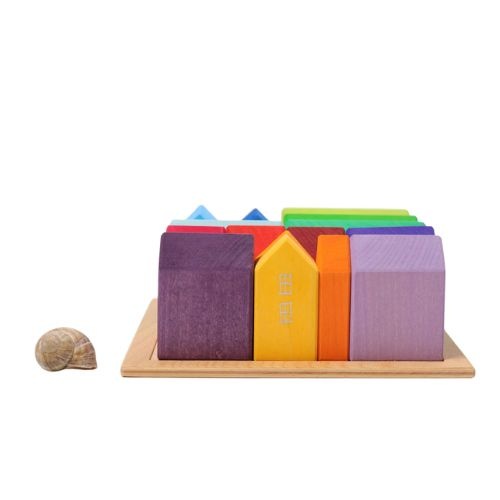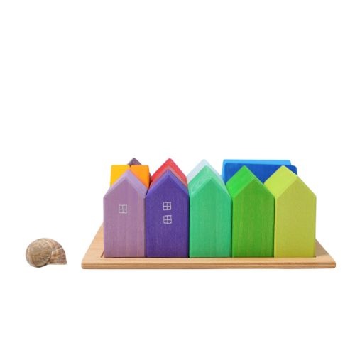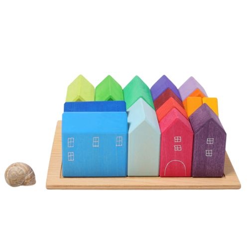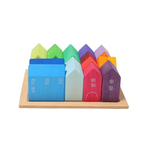 De Grimm's wooden houses 15 stuks houten speelhuisjes bestel je online bij Labels for Little Ones. Met deze bouwhuisjes set kunnen kinderen makkelijk stapelen en bouwen. Leuk om te combineren met de bruggen andere blokken van Grimms voor een overvloed aan speelmogelijkheden. Dit speelgoed stimuleert op een speelse manier ruimtelijk inzicht en de ontwikkeling van fijne motoriek.