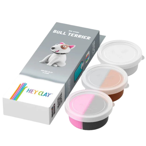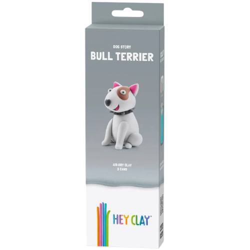De Hey Clay bull terrier 3 cans boetseerklei bestel je online bij Labels for Little Ones. Gebruik deze zelfhardende boetseerklei en de bijbehorende app om bull terrier hond te boetseren. De knutselset bevat alle benodigdheden om dit hondje te creëren. In