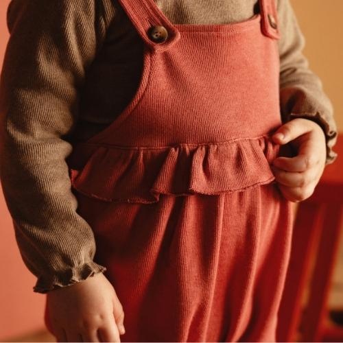 Shop de Nixnut ruf salopette spice jumpsuit online bij Labels for Little Ones. Deze salopette is uitgevoerd in een oranje roze kleur spice. Het tuinbroek model, de doorlopende ruffled boord, de subtiele ribstof en de omgeslagen broekspijpjes geven een leuk effect aan het pakje. Het Nixnut pak heeft een comfortabele fit door de zachte katoenen stof en fijne pasvorm. Draag deze dungaree over een longsleeve of blouse.