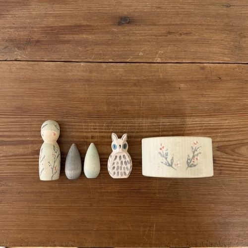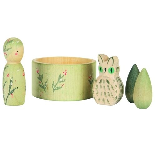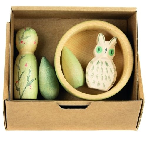 * inhoud: 5 elementen van hout; een handgemaakte uil, nin poppetje, bakje en twee groene bomen