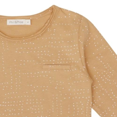 Het Phil&Phae Pocket tee l/s drawn dots mellow apricot shirt bestel je online bij Labels for Little Ones. Deze mooie longsleeve is uitgevoerd in de lichte bruin oranje kleur Mellow apricot en heeft een all-over print van witte stipjes. De tee heeft een comfortabele fit door de zachte stof samenstelling van biologisch katoen en de mooie pasvorm.