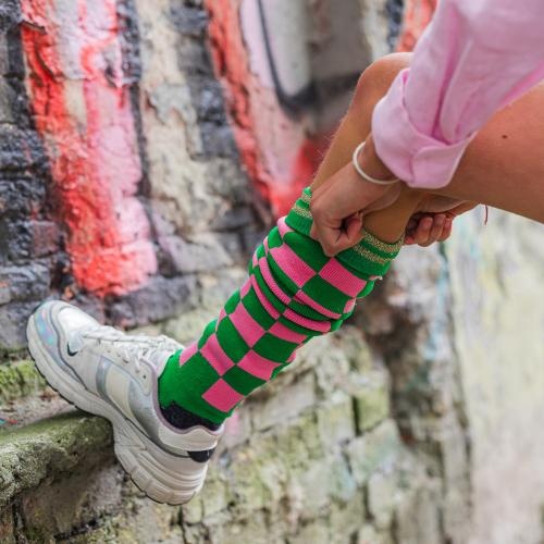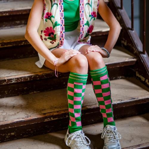 De Pindahs hockeysocks Emma check hockeysokken bestel je online bij Labels for Little Ones. Shinen op het hockeyveld met deze te gekke hockeysokken uitgevoerd in een groene basiskleur met all-over check print van roze vierkanten en met een gestreept glitterrandje. Naast dat de sportsokken er natuurlijk super tof uitzien, hebben ze ook een comfortabele elastische pasvorm en is het voetbed gemaakt van polycolon, wat ervoor zorgt dat de voeten koel blijven tijdens het sporten. De perfecte hockeysok!