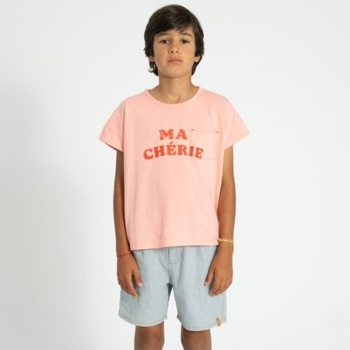 Shop de Piupiuchick baby t-shirt light pink w/ "ma chérie" print online bij Labels for Little Ones. Een leuk tshirt van lichtroze katoen uitgevoerd met een tekstprint op de voorkant en een borstzakje. Op de achterkant een print met een grote kers. De tee heeft een iets wijdere pasvorm en een omgeslagen randje bij de mouw.
