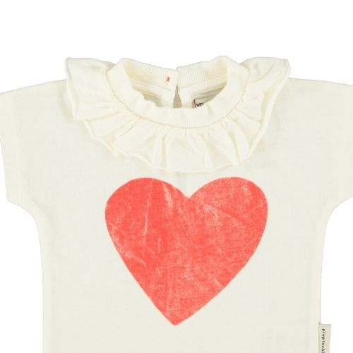 Shop de Piupiuchick baby t-shirt w/ collar ecru w/ red heart print online bij Labels for Little Ones. Een leuk tshirt van witte katoen uitgevoerd met een hartje op de voorkant en een mooie kraag met volants. Bij de babymaten heeft de tee een houten knoopsluiting op de achterkant.