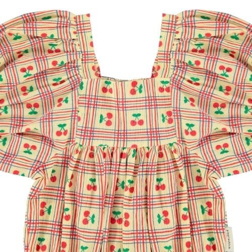 * uitgevoerd in gele katoen met subtiele textuur in de stof en aop met kersen