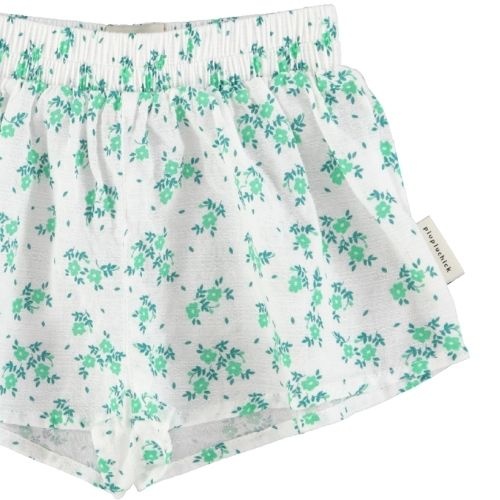 Shop de Piupiuchick shorts ecru w/ green flowers allover online bij Labels for Little Ones. Een heerlijke korte broek uitgevoerd in een ecru kleur met all-over- print met groene bloemen. Het broekje heeft een kort model en is elastisch aan de achterkant van de tailleband. Het shortje loopt bij de broekspijpjes naar de onderkant toe iets wijder uit.