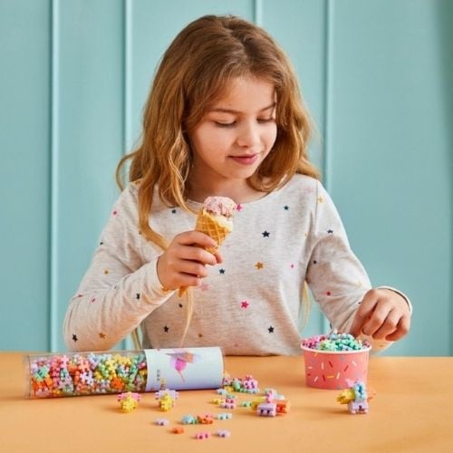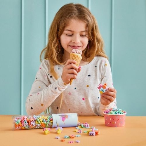 De Plus-Plus gelato mix 240 stuks tube bevat 240 zoete ijsjes kleuren stenen om plat mozaïek mee te maken of 3-D figuren mee te bouwen. Je kan dit bouwstenenpakket makkelijk opbergen en overal mee naartoe nemen dankzij deze handige buis. Deze bouwset is geschikt voor open ended play, een bouwsteentje meet 20cmm x 12 mm die perfect in elkaar passen en zo kunnen kinderen alle bouwen wat ze zelf bedenken!